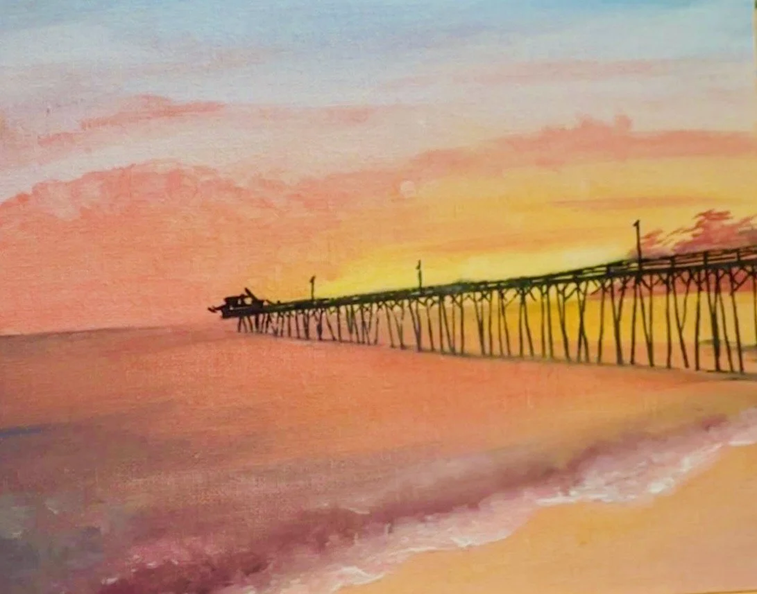 Painting of a wooden dock extending over a calm body of water at sunset or sunrise, with mountains in the distance and a colorful sky.
