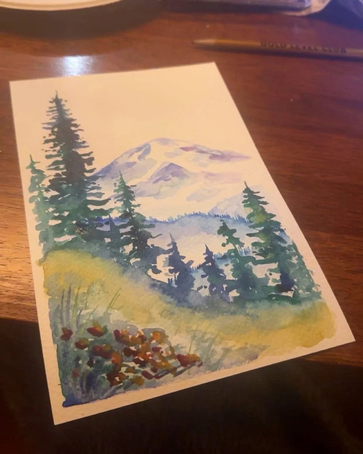 A watercolor painting of a mountainous landscape with a snow-capped peak in the background, tall pine trees in the middle ground, green and brown bushes in the foreground, and a soft, cloudy sky.