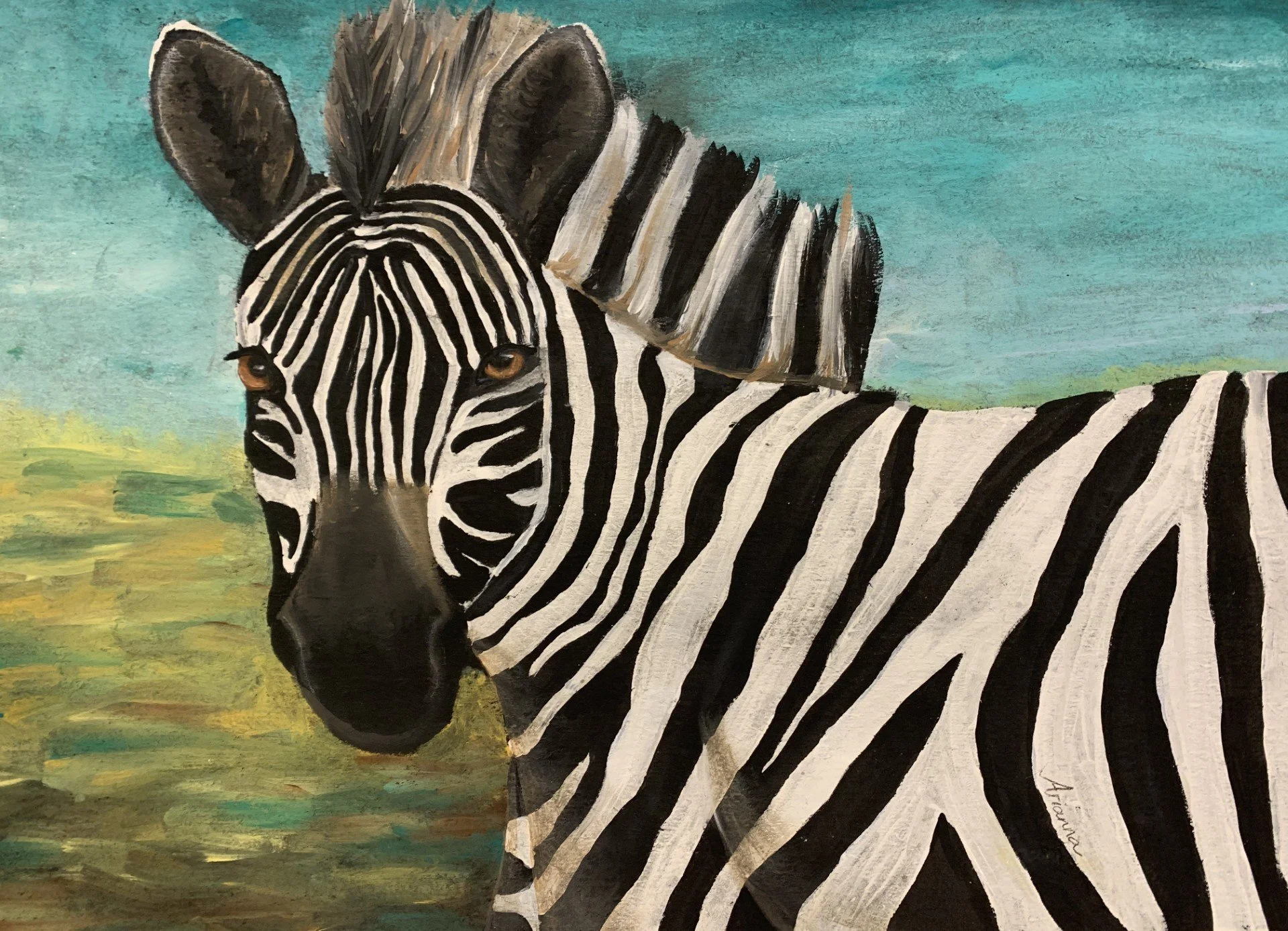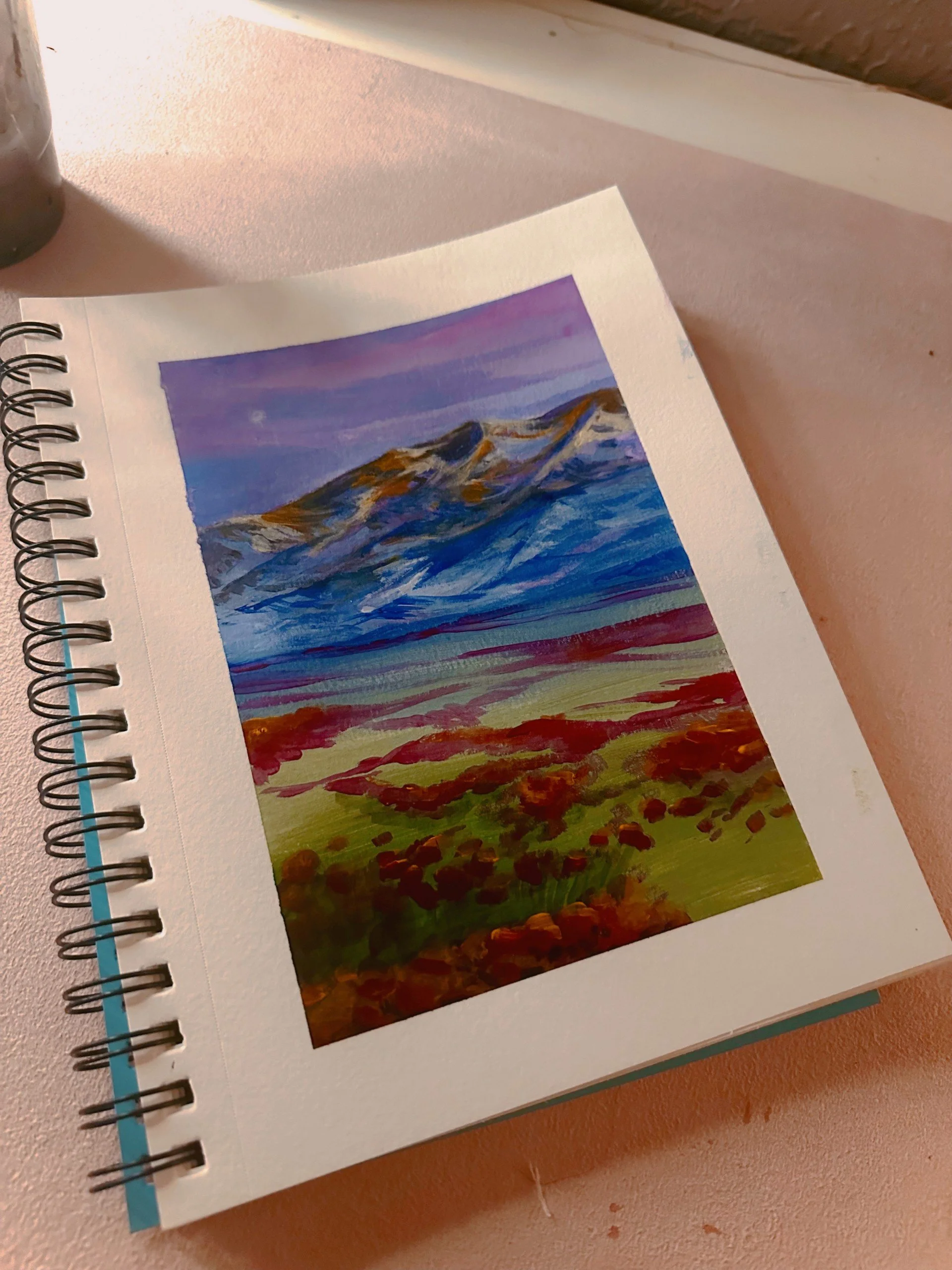 A painted landscape of a mountain with snow caps, a colorful sky, and a field with shrubs in the foreground.