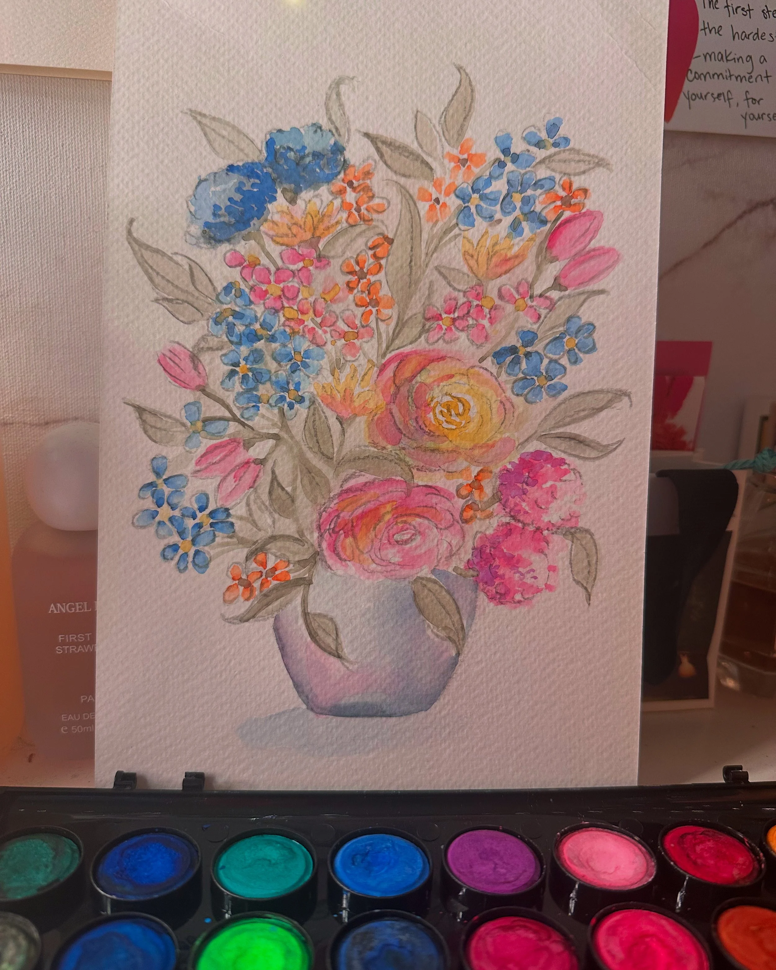 Watercolor painting of a colorful flower bouquet in a purple vase with pink, yellow, blue, and orange flowers, and grayish-green leaves.