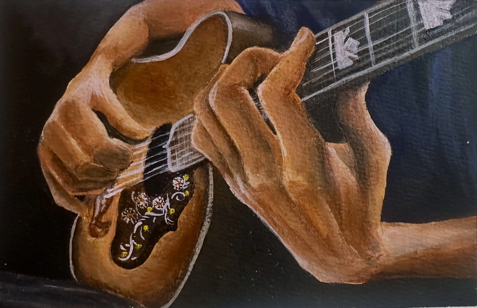 A realistic black and white sketch of a sports car on a piece of paper, with painting supplies nearby.