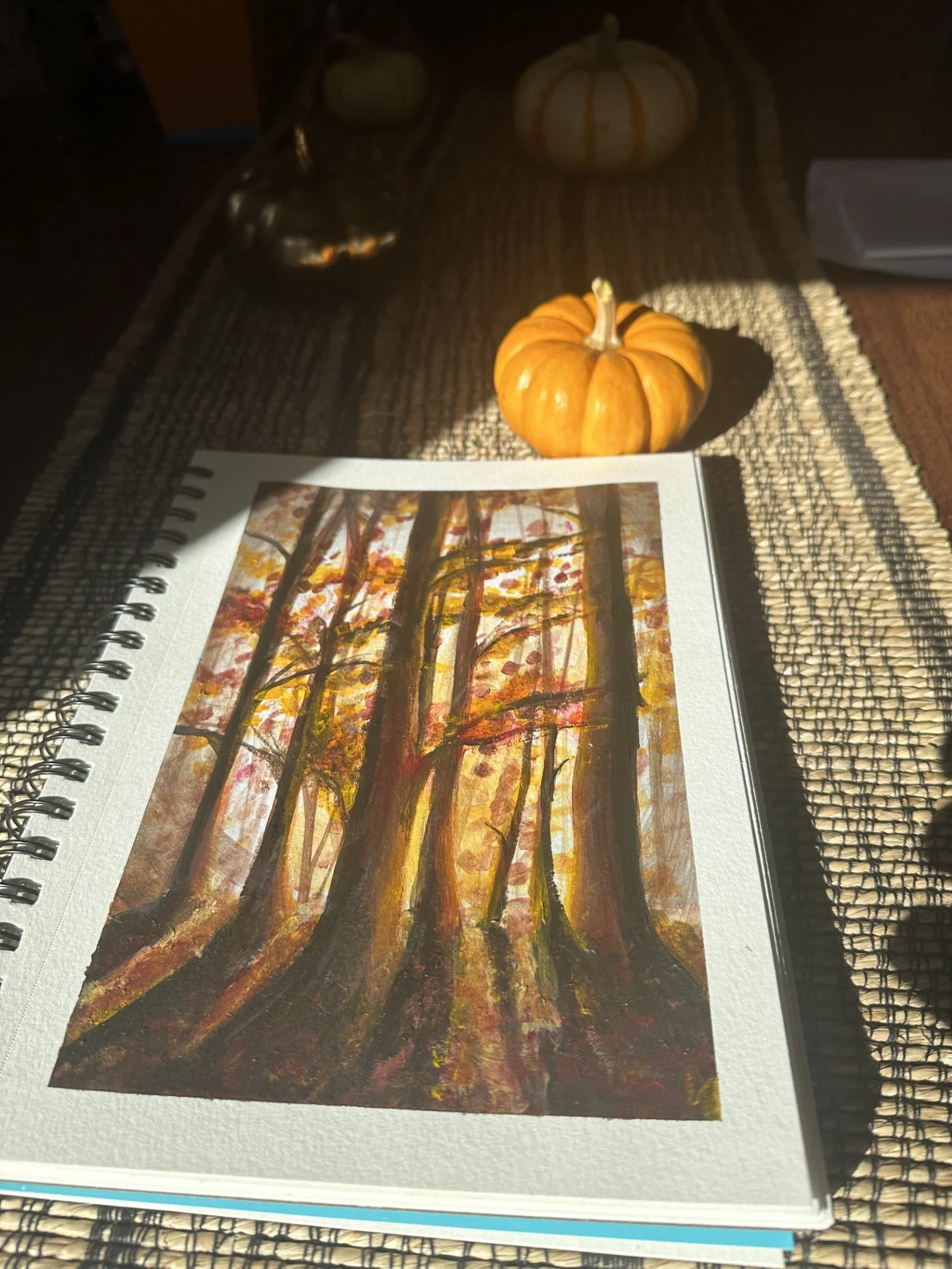 A sketchbook open on a table, displaying a watercolor painting of a forest scene with trees and autumn foliage. The table is decorated with small pumpkins and a glass vase with dried flowers, with sunlight casting shadows on the table.