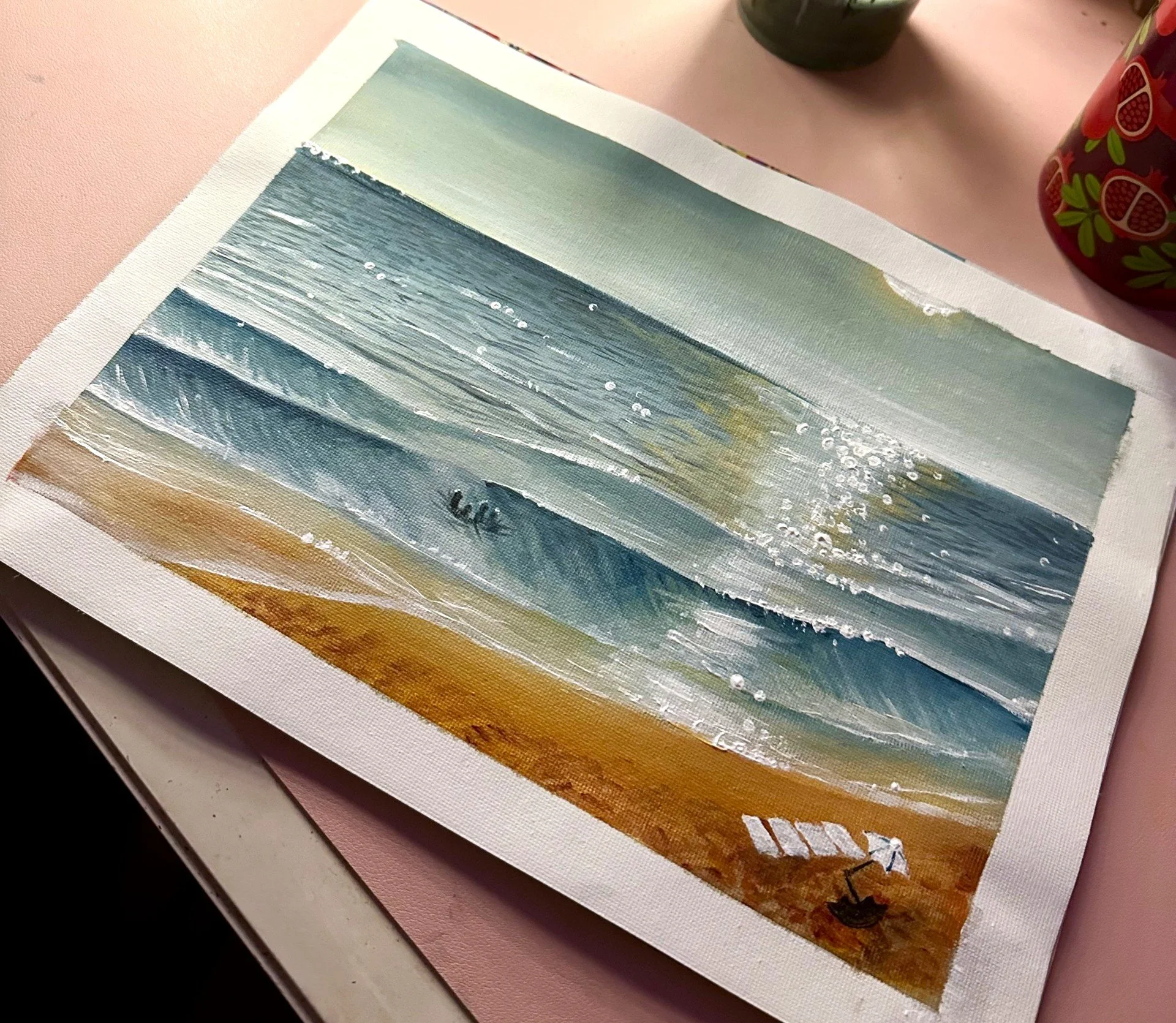 Painting of a beach scene with waves, a sandy shore, and a small boat, on a pink table with a green bottle and a red container nearby.