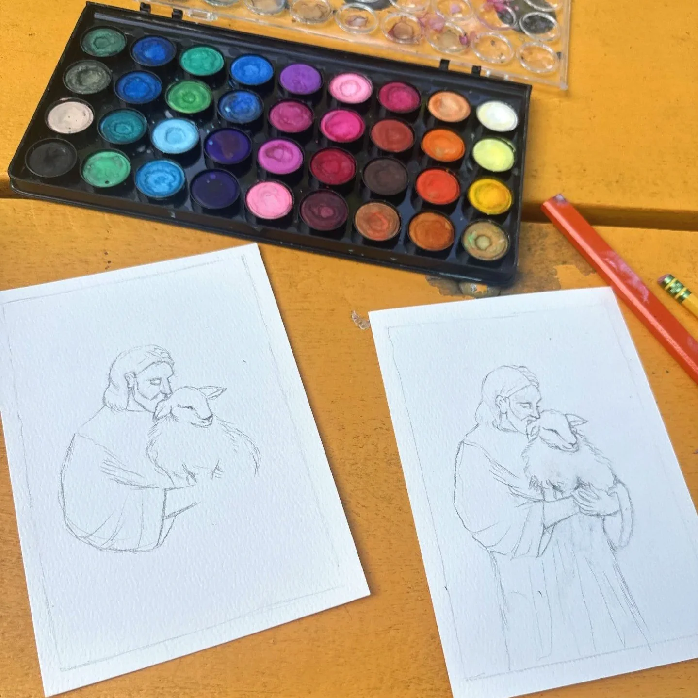 Two pieces of watercolor paper with pencil sketches of a person hugging a dog, watercolor paint set, a red pencil, and an eraser on a yellow wooden table.